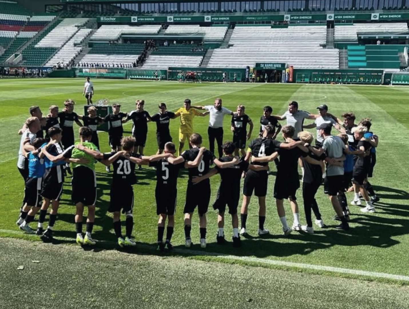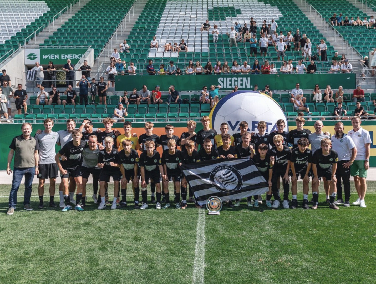 Die U15-Mannschaft der AKA Steiermark – Sturm Graz holte sich den ersten Platz beim Varta Cup des SK Rapid in Wien. Dabei ließen unsere Burschen Teams wie Barcelona, Ajax Amsterdam oder Bayern München hinter sich. Im Finale, das in der Allianz Arena gespielt wurde, konnte Rapid mit 2:1 besiegt werden. Beide Treffer erzielte Jonas Peinhart, der sich damit zum Torschützenkönig krönte. Ein erfolgreiches Wochenende haben auch unsere U10- und U13-Teams hinter sich.