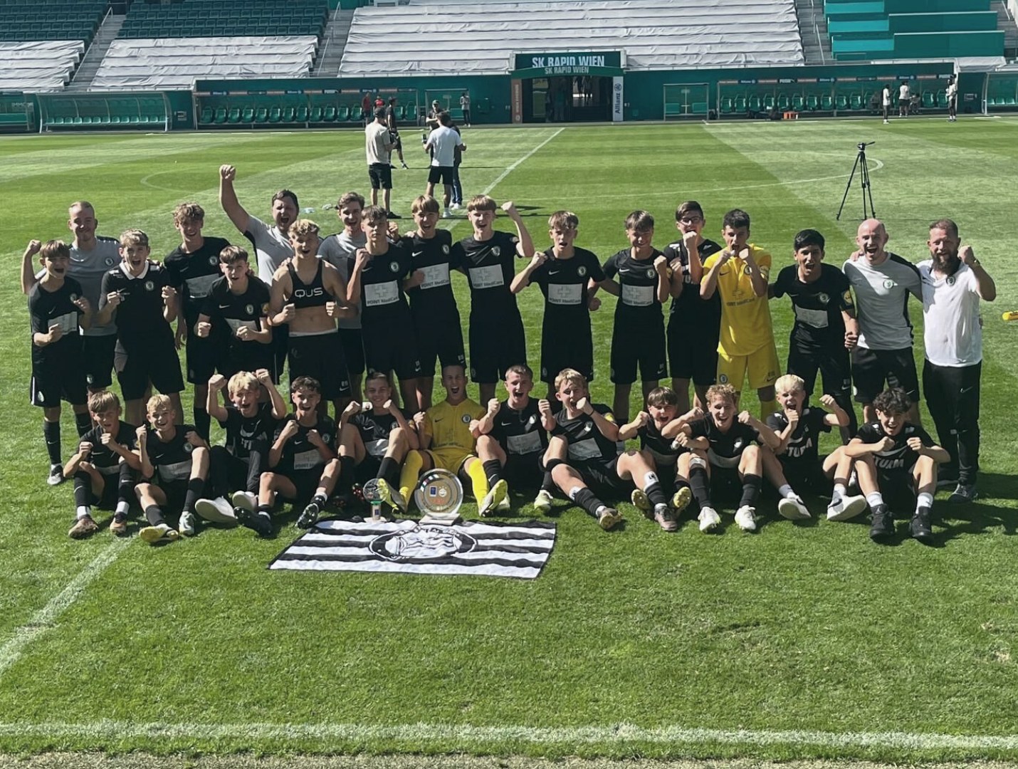 Im Endspiel, das als einziges Match des Turnieres in der Allianz Arena ausgetragen wurde, ging es gegen Gastgeber Rapid. Auch da ließen die frechen Grazer nichts anbrennen und gingen durch Jonas Peinhaupt mit 1:0 in Führung, Rapid schaffte gleich nach dem Seitenwechsel den Ausgleich, Sturm hatte mit einem Lattenschuss Pech. Danach blieb es Offensivkraft Jonas Peinhaupt vorbehalten, den Siegestreffer für Sturm zu erzielen. Mit insgesamt vier Toren krönte sich Peinhaupt auch zum Torschützenkönig des Turnieres (dem Rapids Oliver Strunz gratuliere, siehe Bilderserie unten). Sehr zur Freude der steirischen Delegation zeigte die U15 drei Tage Spitzenfußball in Wien. Das sah übrigens auch die Rapid-Spitze mit Alexander Wrabetz, Steffen Hoffmann und Markus Katzer. Sturm-Präsident Christian Jauk stellte sich gleich nach dem Finale mit einer Grußbotschaft und der Gratulation zum Turniersieg ein: „Ich bin stolz auf euch und und hoffe, dass wir eines Tages eines dieser Toptalente auch in der Kampfmannschaft sehen!“ Didi Pegam abschließend: „Die Burschen haben ein tolles Turnier gespielt. Sie zeigten keine Scheu vor den großen Mannschaften. Das ist eine Auszeichnung für die tolle Arbeit, die bisher geleistet wurde.“ Dem kann man sich nur anschließen. Bravo, Burschen!